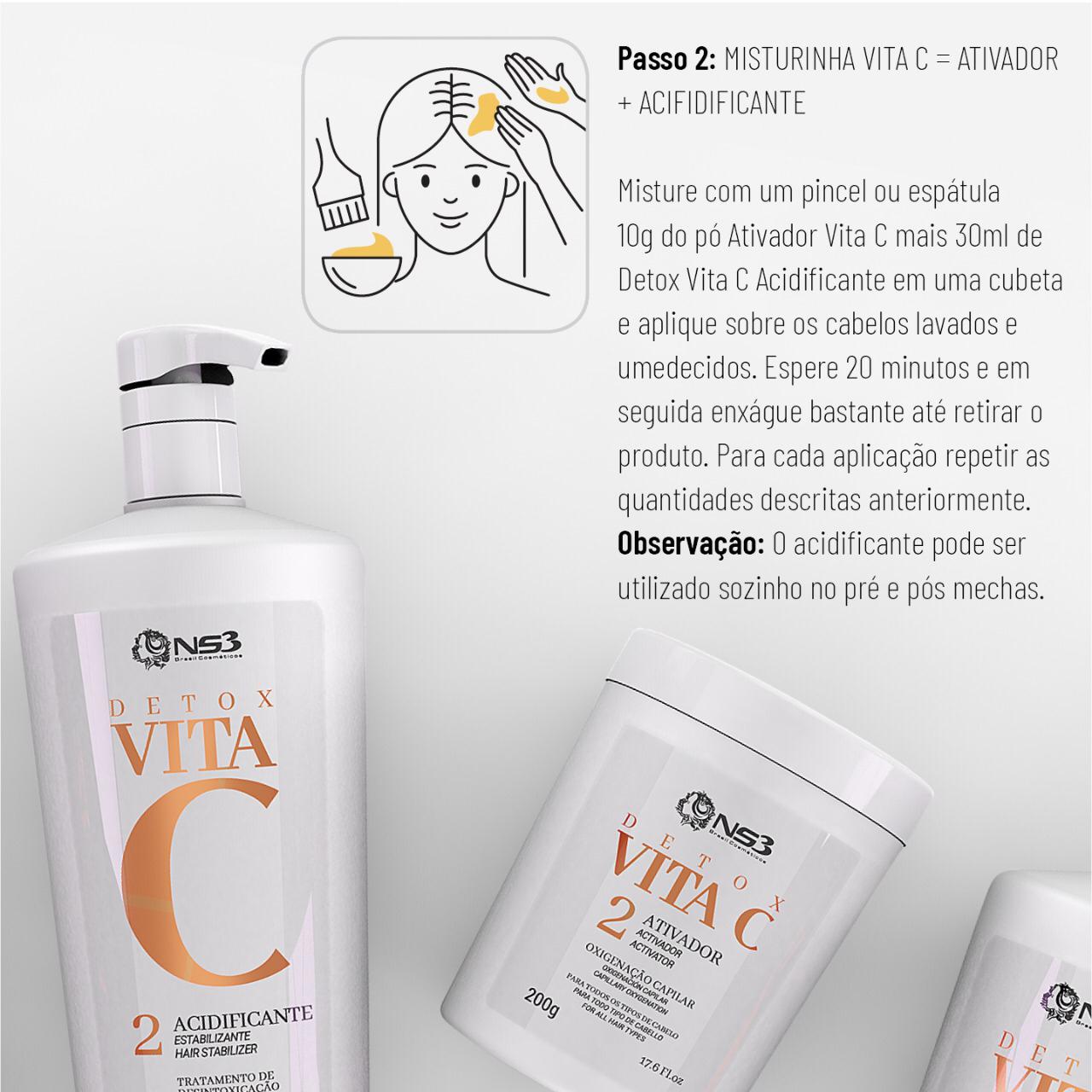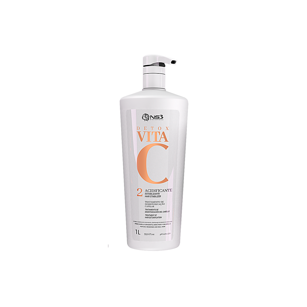 Acidificante Detox Vita C NS3 Brasil 1L é um acidificante de uso profissional desenvolvido para auxiliar no equilíbrio do pH dos fios e na melhoria da aparência do cabelo após procedimentos químicos realizados em salão.