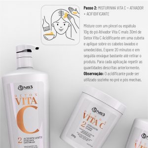 Após a lavagem com shampoo adequado, aplicar o Acidificante Detox Vita C NS3 no comprimento e pontas, distribuindo de forma uniforme. Deixar agir conforme o protocolo profissional adotado e enxaguar completamente.